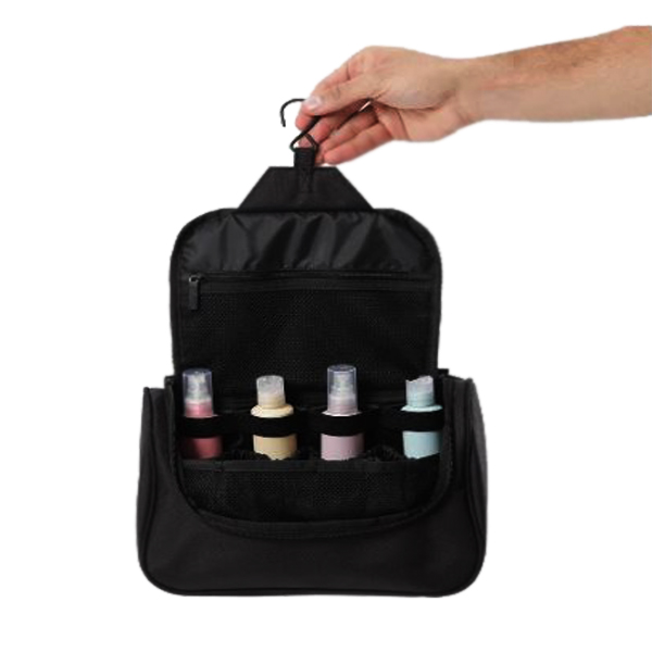 Bolso para kit de aseo personal, elaborado en lona de alta resistencia e impermeable, medidas 18 CM de alto/ 28 CM de ancho/ 8 CM de fondo, costa de bolsillos internos para ingresar útiles de aseo como (cepillo de dientes, maquina de afeitar, crema dental, jabón, entre otros) con un novedoso gancho para colgar donde se quiera, igualmente tiene terciadera al hombro.