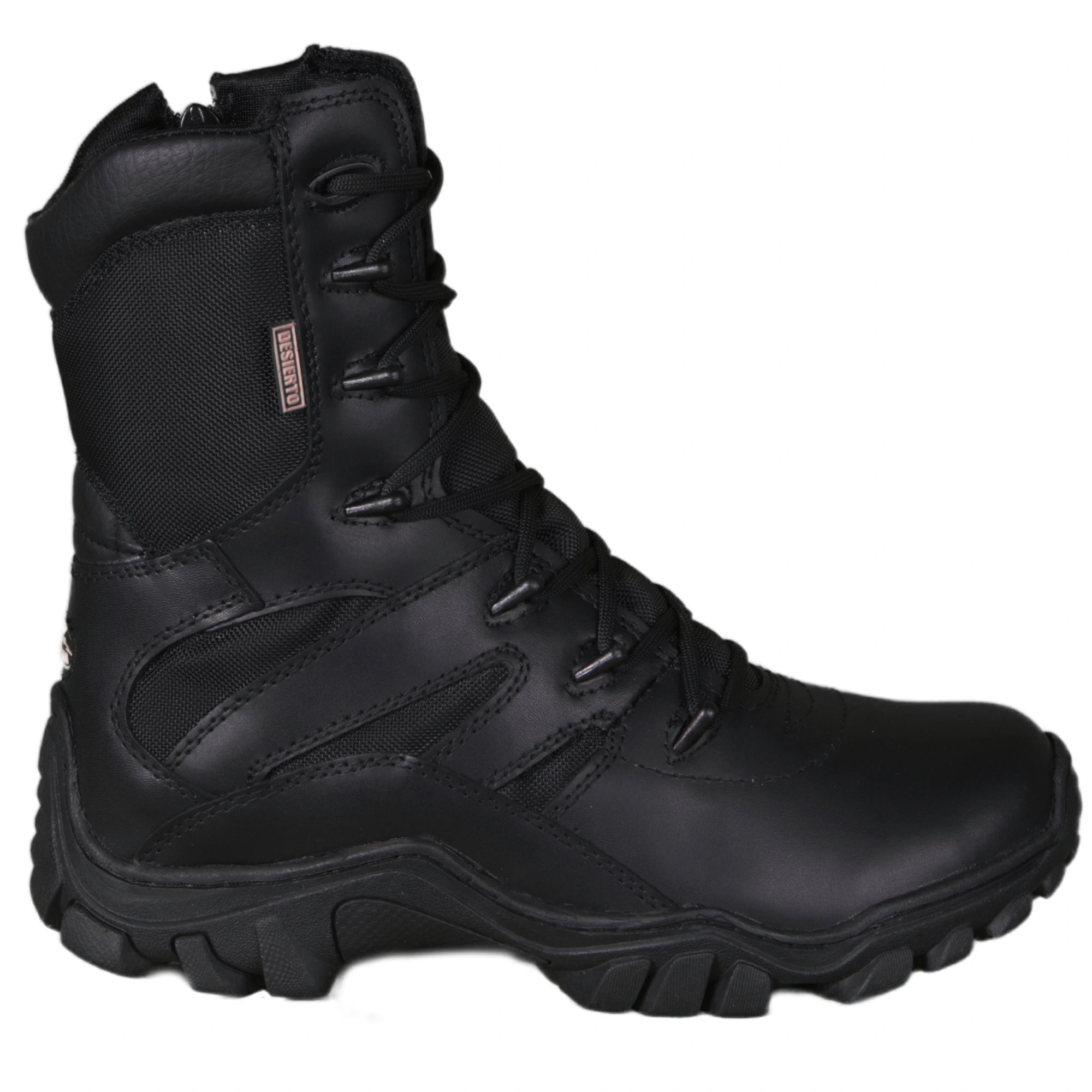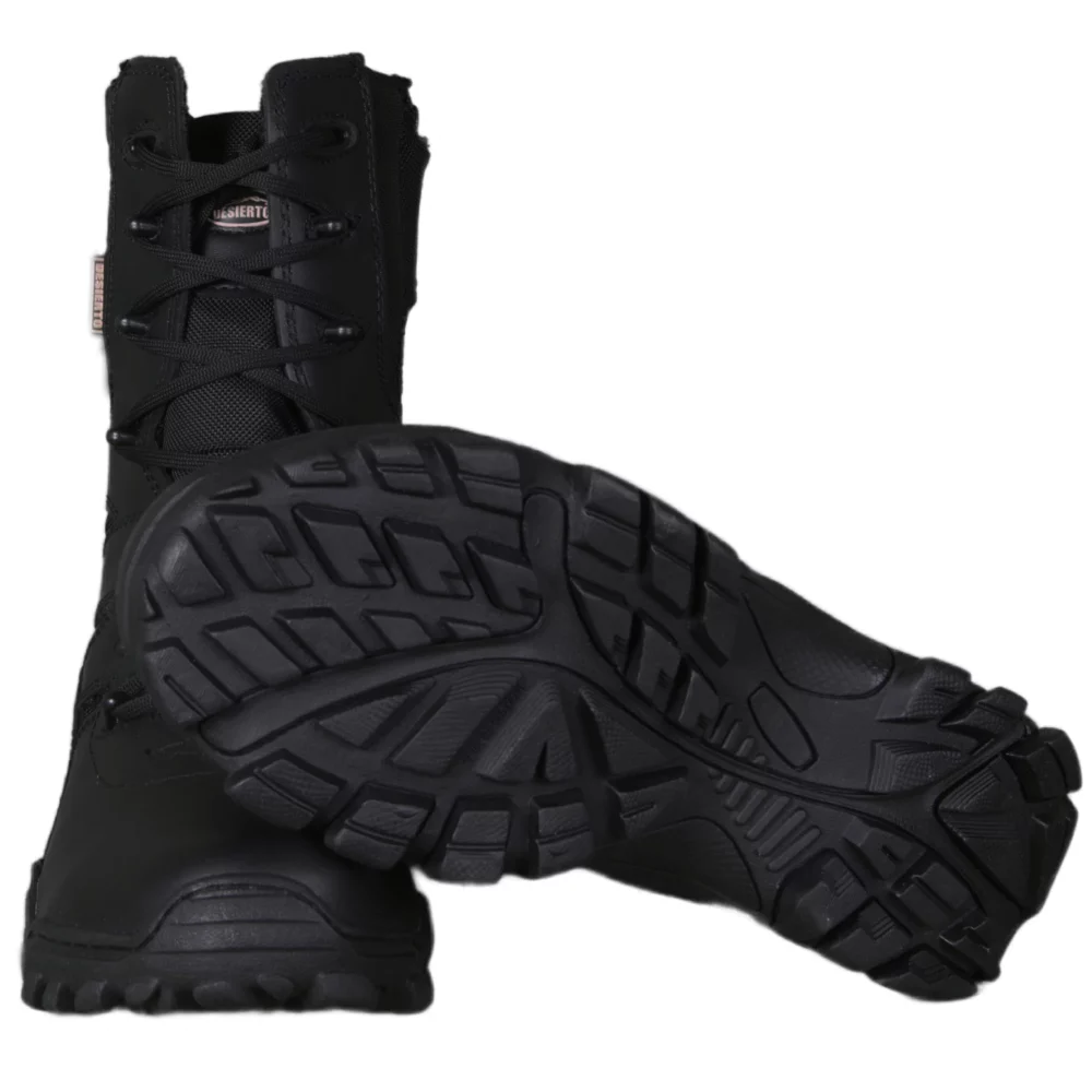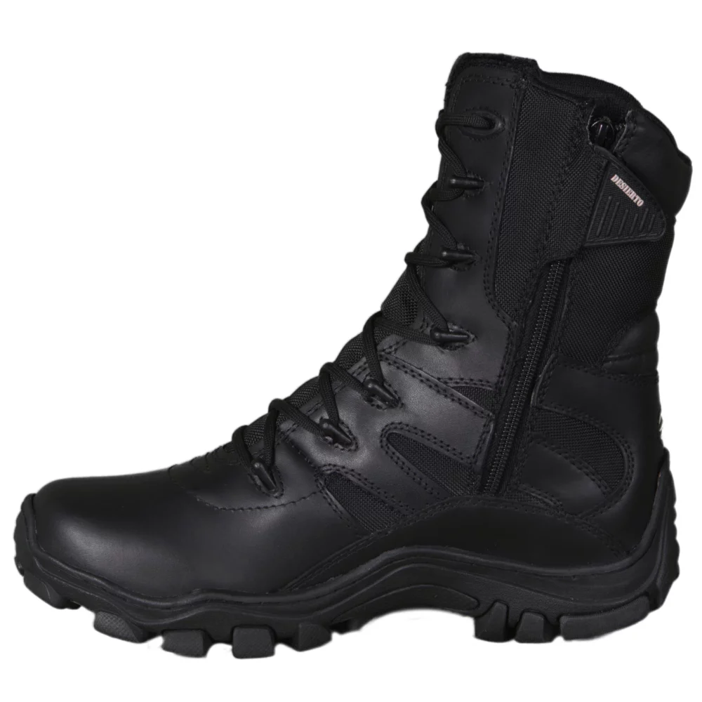 Bota sahara negra elaborada en cuero liso, lona impermeable de alta durabilidad, suela liviana en caucho resistente y antideslizante, vulcanizadas, caña de 20 cm, acolchado interno térmico suave, cremallera lateral y plantilla suave y cómoda.