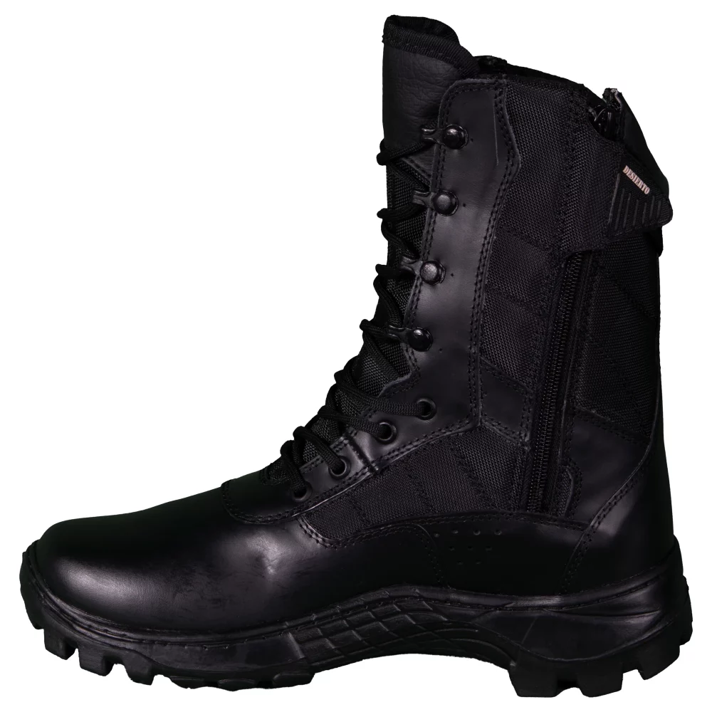 Bota Sonora Negra, elaborada en cuero liso, lona impermeable de alta durabilidad, suela liviana en poliuretano resistente y antideslizante, vulcanizada, medidas caña de 21 cm, acolchado interior térmico suave en poliéster, cremallera lateral y plantilla suave y duradera