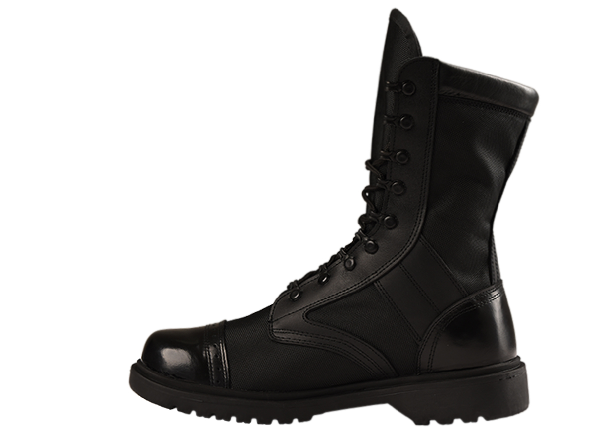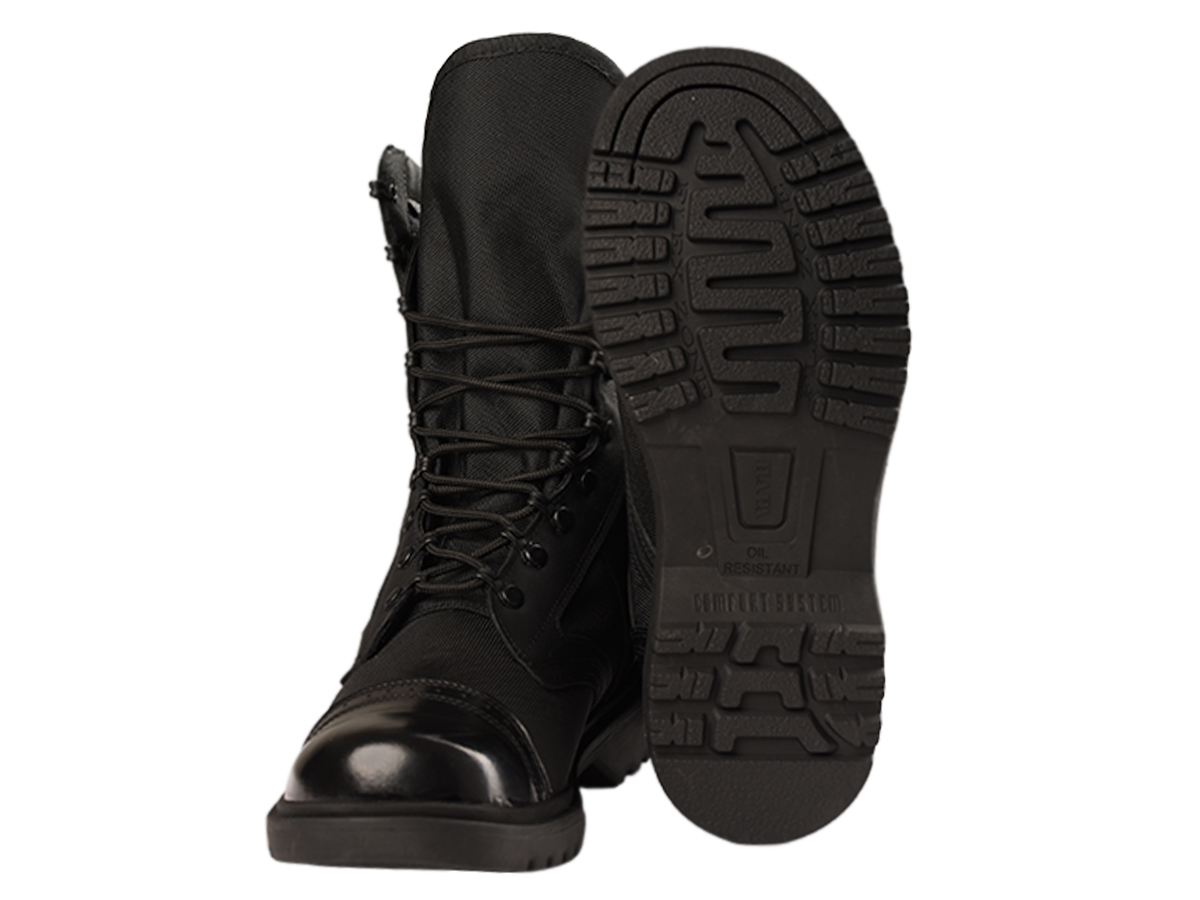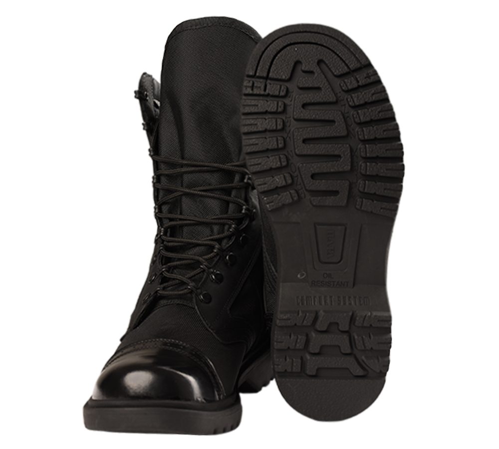 Bota Tatacoa Negra, elaborada en cuero liso, punta en cuero brillante, lona impermeable, suela liviana en caucho antideslizante, cosidas y vulcanizadas, caña de 23 cm, acolchado interno térmico suave y plantilla comoda y resistente