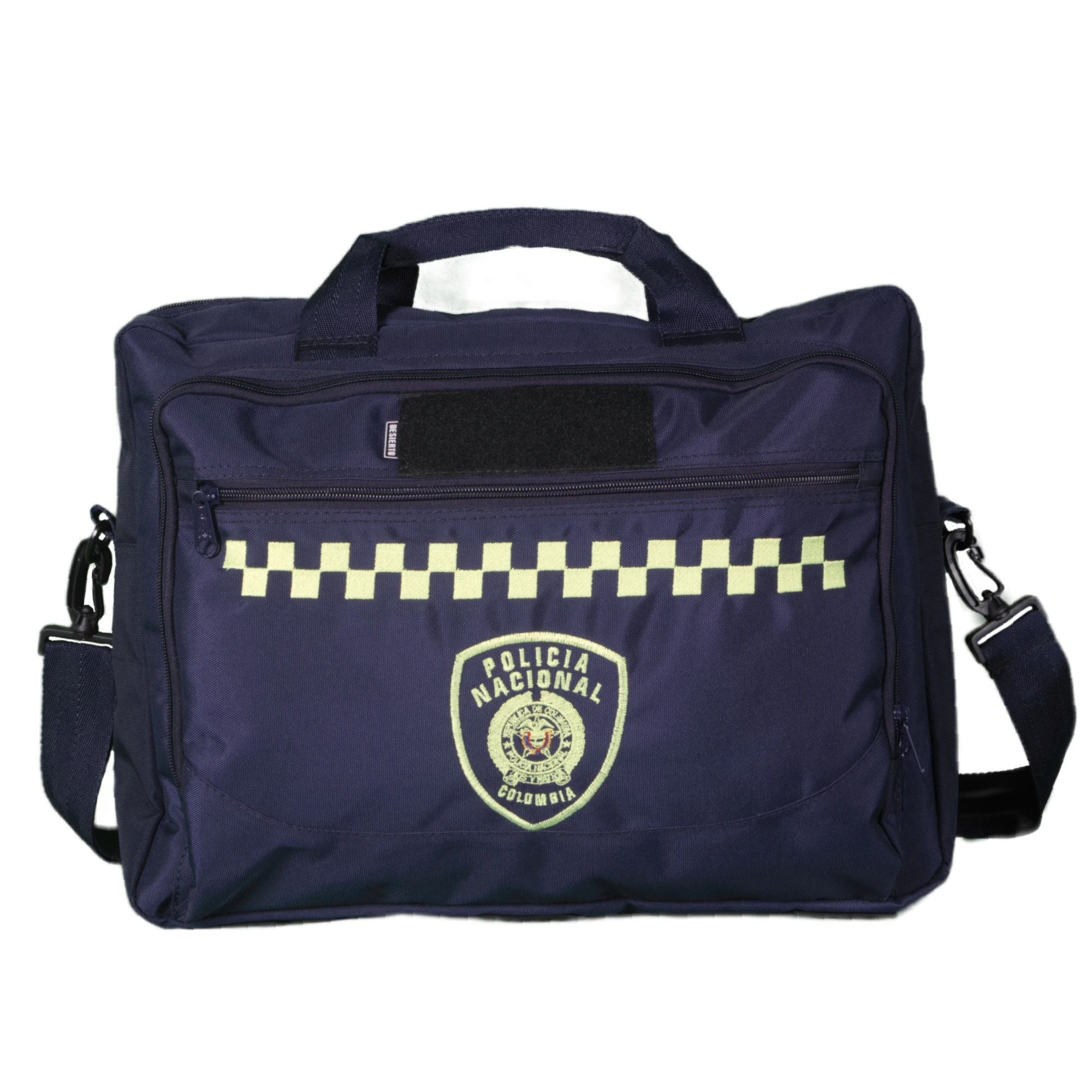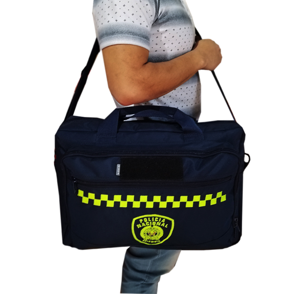Elaborado en lona impermeable con medidas de 48 centímetros de ancho por 38 centímetros de alto por 14 Cm de fondo. Cuenta con dos compartimento grandes, un compartimento externo horizontal de 38 centímetros con cremallera y un compartimento posterior, manija y soporte a hombro.
